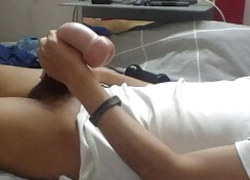 Mira como masturbo mi polla con cambios de ritmo hasta conseguir una corrida jugosa, quiero que la tragues