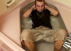 Fully clothed twink Kelly Cooper masturbates in bathtub