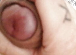 Close up uncut cock cums twice